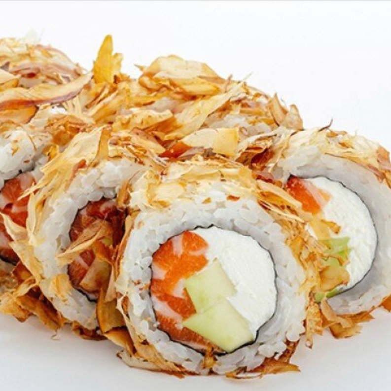 Нори, рис, творожный сыр, лосось, авокадо, стружка тунца.