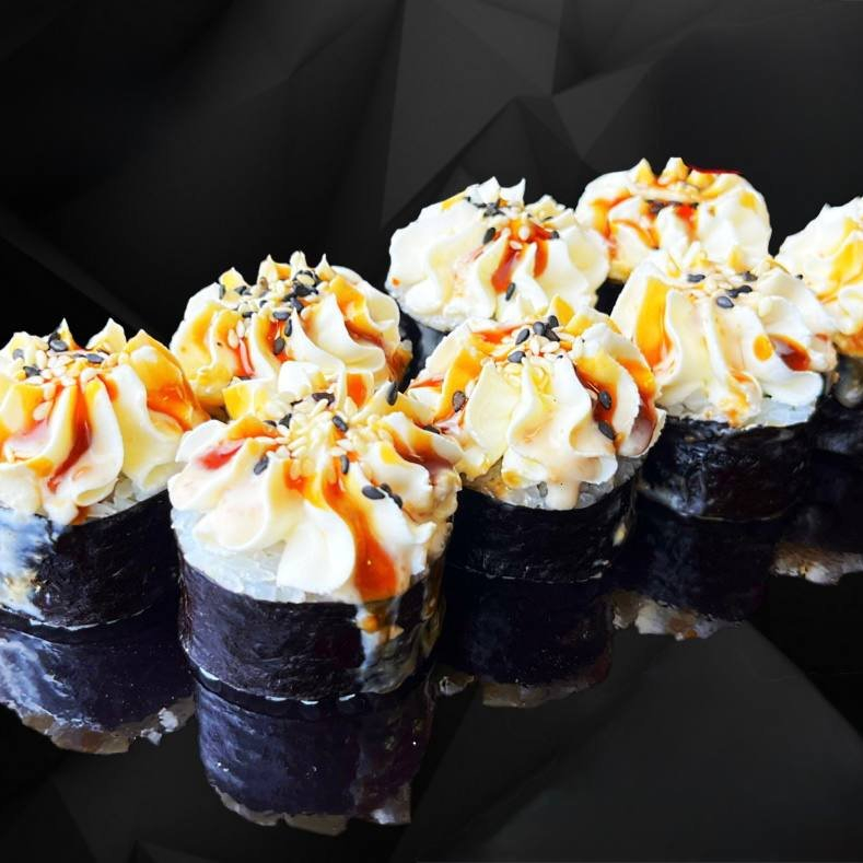 Рис, нори, тунец, такуан, огурец, сливочный сыр, икра массаго.