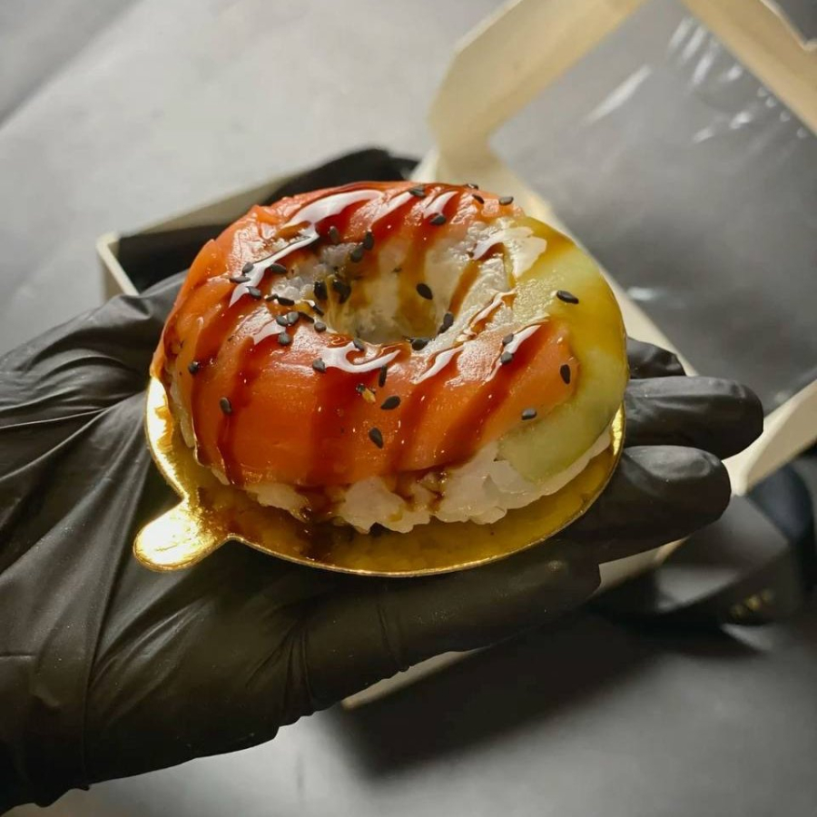 Нори, рис, лосось, такуан, огурец, крем-чиз (1шт); Нори, рис, лосось, такуан, крем-чиз (1шт); Нори, рис, такуан, крем-чиз (1шт).
