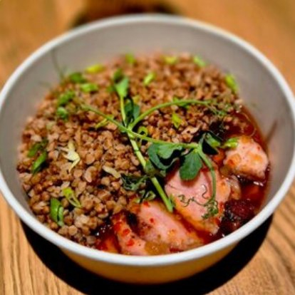 Свинина, гречка, соус кисло-сладкий, зелёный лук.