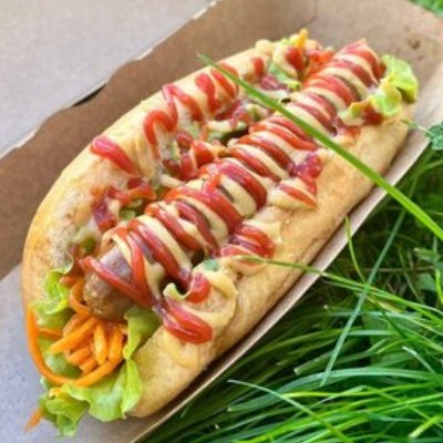 Булочка, колбаска, кетчуп, горчица, огурчик маринованный, айсберг.
