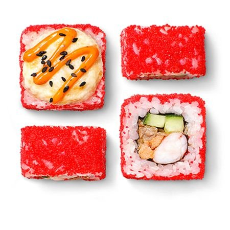 Рис, нори, сыр, лосось, креветка, цыплёнок, огурец, кунжут, соус спайси, пармезан.