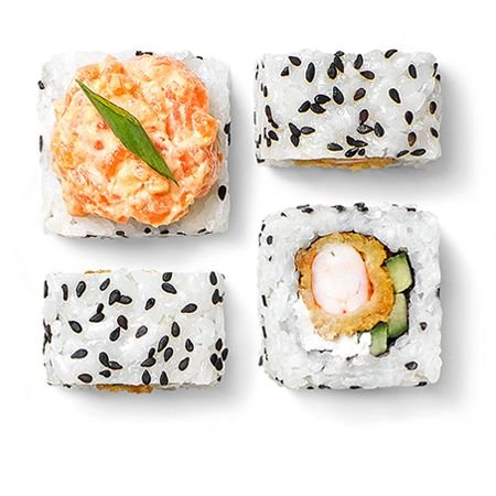 Креветка темпура, лосось, сливочный сыр, огурец, спайси соус, лук зелёный, кунжут.
