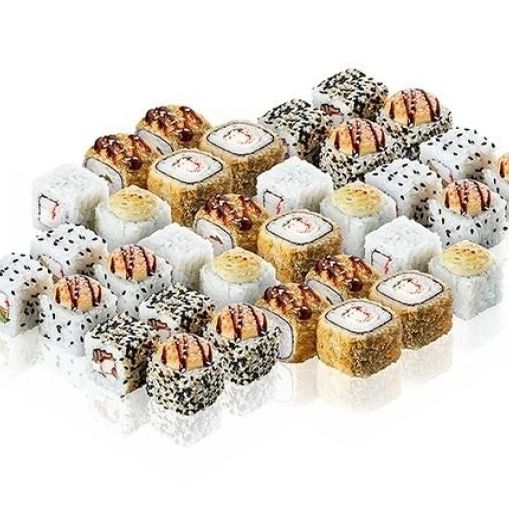 Ролл огурец, Ролл краб, Смайл, Цезарь, Калифорния классическая, Хокку, Папа Может, Креветка Терияки. Топпинги не идут в комплекте.