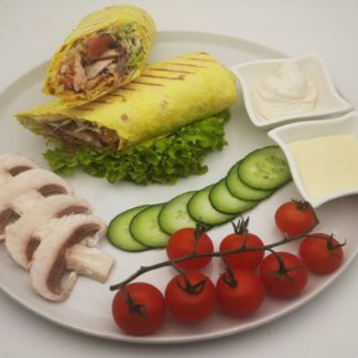 Лаваш, курица гриль, капуста, помидор, огурец, грибы, соус фирменный, соус сметанно-грибной.