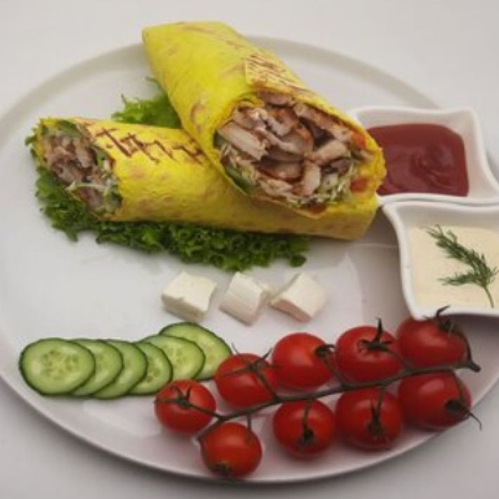 Заказать Лаваш, курица гриль, капуста, помидор, огурец, крем-чиз, соус фирменный, соус томатный.