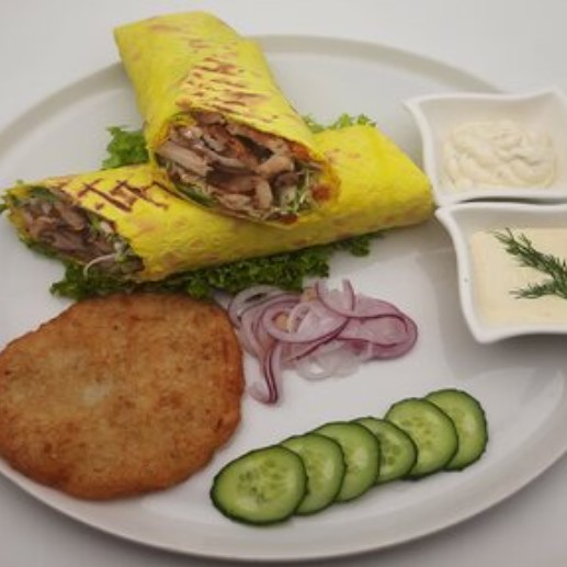 Заказать Лаваш, курица гриль, капуста, огурец, картофель, лук маринованный, соус тартар, соус фирменный.