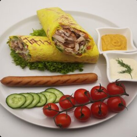 Заказать Лаваш, курица гриль, капуста, помидор, огурец, колбаски копчёные, соус фирменный, соус горчичный.