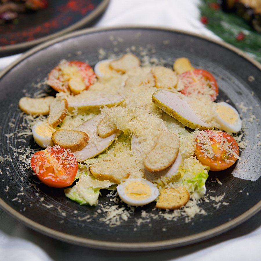 Заказать Куриное филе, листья айсберга, помидоры черри, гренки, перепелиные яйца, сыр пармезан, фирменный соус Цезарь.