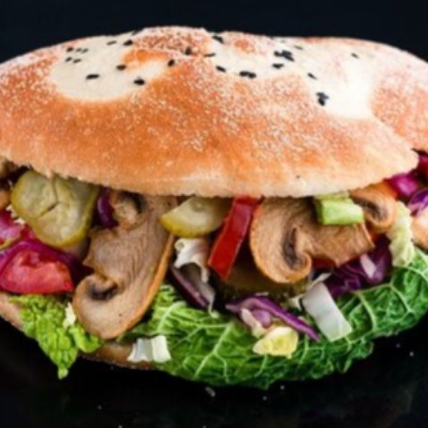 Заказать Грибы, микс-салат, огурец маринованный, лук маринованный, томат, соус кинза, соус ореховый, пита.