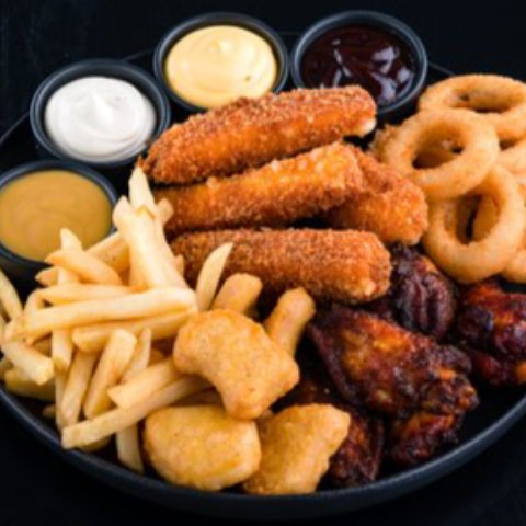 Заказать Крыло карри (5шт), луковые кольца (5шт), сырные палочки (5шт), наггетсы (5шт), картофель фри, соус сырный, соус барбекю.