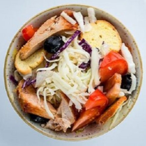 Заказать Микс-салат, томат, курица жареная, маслины, сухарики, сыр пармезан, соус цезарь.