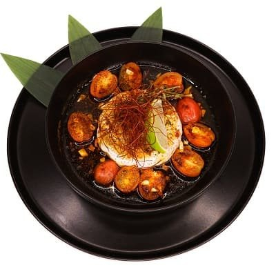 Каперсы, тунец, кунжутное масло, соевый соус, зеленый лук, сок лайма, авокадо, соль, лук севок, карнишоны, желток перепелки, розмарин, маслины, чиабатта, лайм.