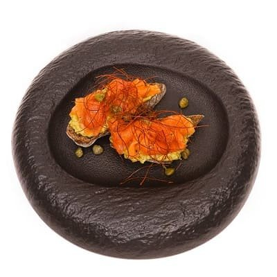 Каперсы, тунец, кунжутное масло, соевый соус, зеленый лук, сок лайма, авокадо, соль, лук севок, карнишоны, желток перепелки, розмарин, маслины, чиабатта, лайм.