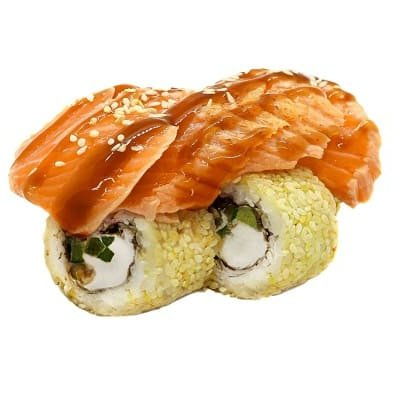 Рис, нори, сыр, огурец, авокадо, лосось, соус терияки, кунжут белый, возможны элементы декора.