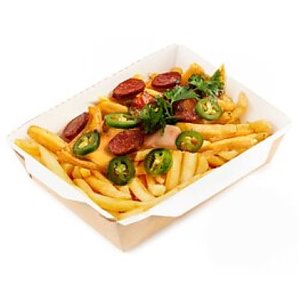 Чориззо, картофель фри, халапеньо, соус сырный чеддер, соус форменный, зелень.