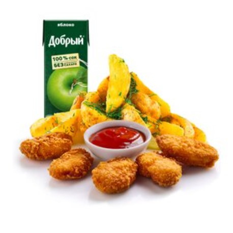 Наггетсы (5 шт.), картофель по-деревенски, сок и соус на выбор.
