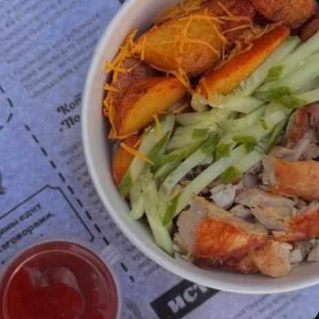 Картофель, сметана, лук, зелень, курочка с гриля.