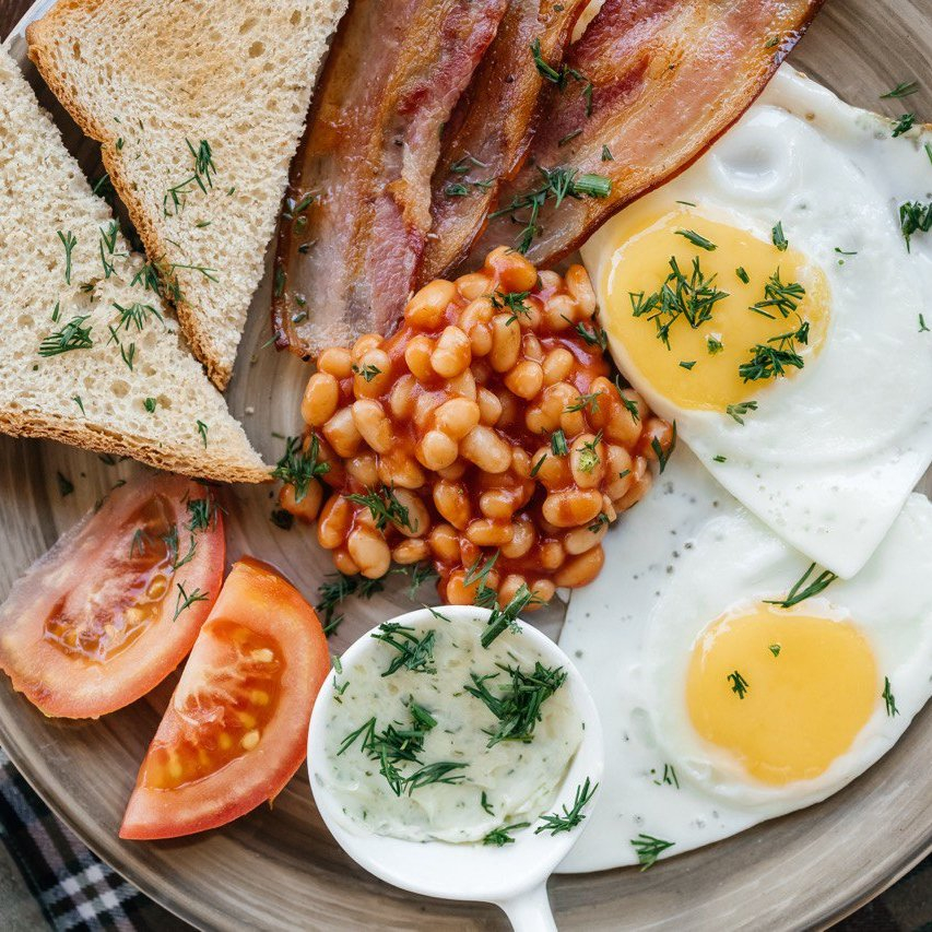 Заказать Глазунья из двух яиц с обжаренным беконом, томатами, тостами с зеленым маслом, Кофейня ДОМ