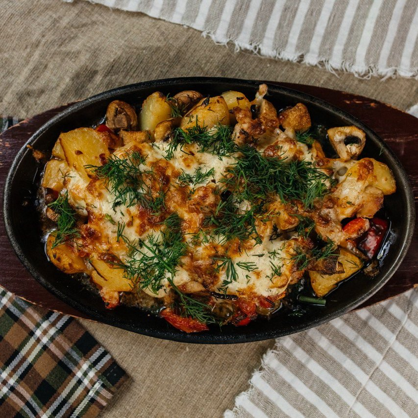 Заказать Сковородка с цыпленком, картофелем, грибами, томатами под сырной корочкой.