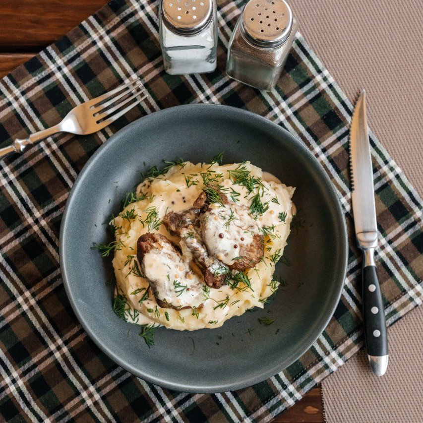 Заказать Свинина томленая в печи в сливочно-горчичном соусе с пюре.