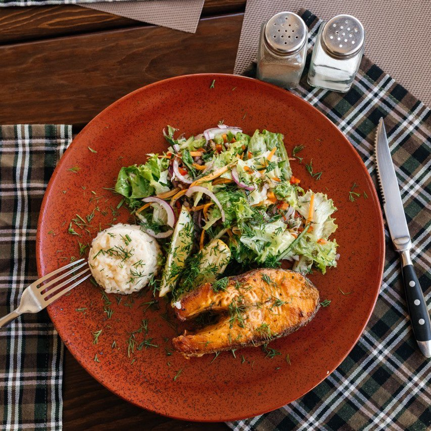 Заказать Стейк из семги со свежими овощами и рисом (возможно приготовить на пару).