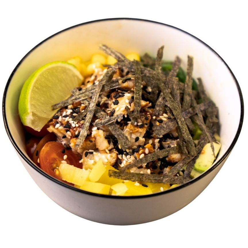 Заказать Угорь, чука салат, авокадо, томаты черри, кукуруза, рис, нори, спайси соус, такуан, соус унаги, лайм, кунжутный микс.