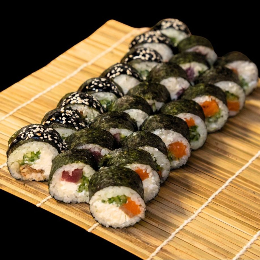 Заказать Ролл Тори, Ролл Сакура, мини ролл с тунцом, ролл с обожженным морским окунем и кисло-сладким соусом чили, ролл Филадельфия кунжут.