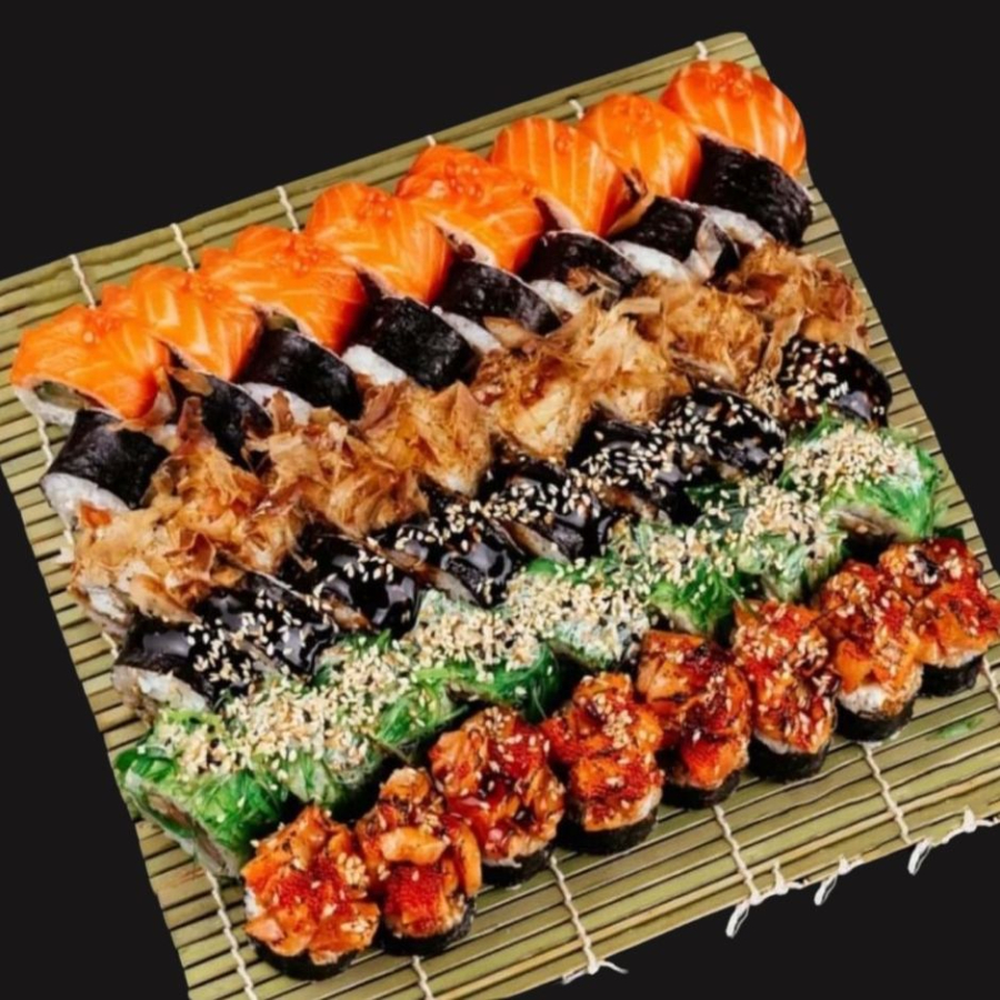 Грин ролл, ролл Фудзи, ролл Бонито, ролл с угрем и огурцом, ролл с лососем и сливочным сыром, ролл Филадельфия Роял.
