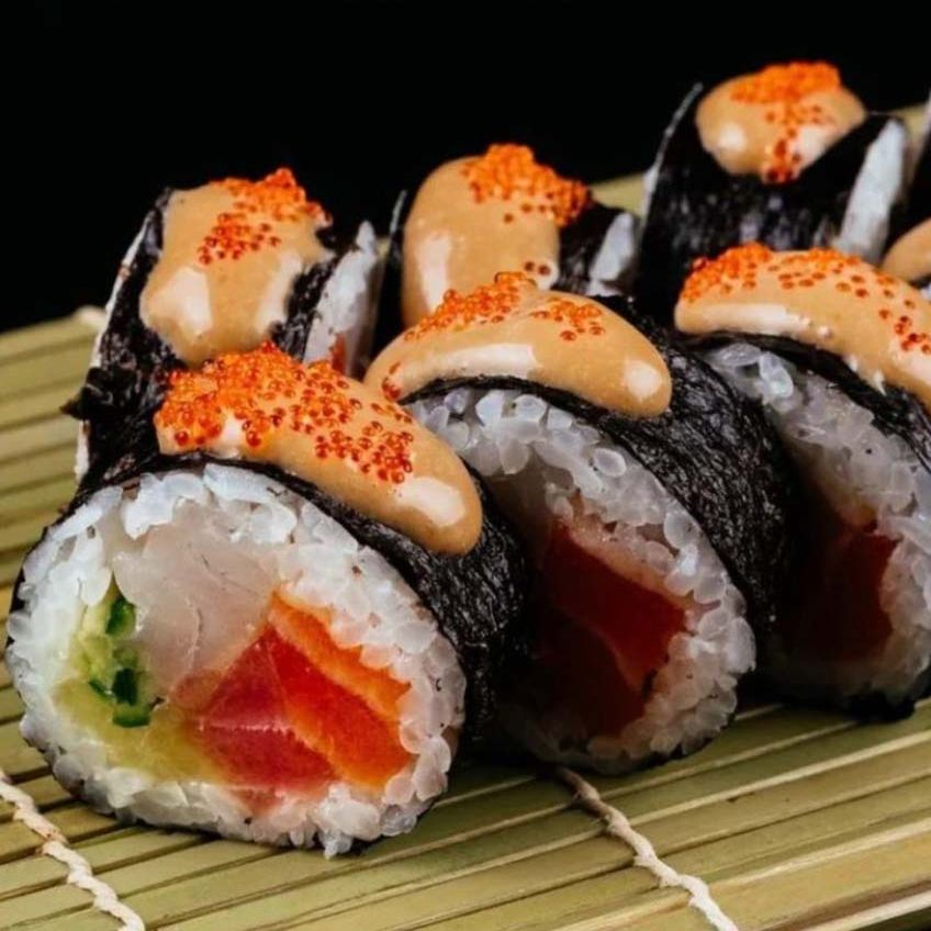 Рис, нори, тигровая креветка, соус с икрой трески, лосось, халапеньо, огурец, миндальная стружка, соус ХЗ, икра тобико.