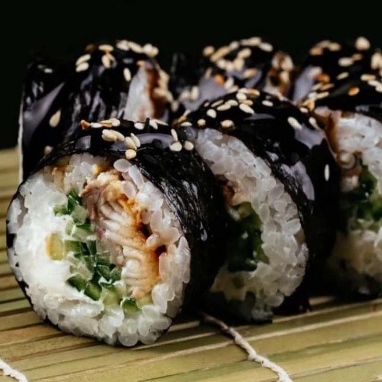 Рис, нори, копченый угорь, огурец, соус унаги, кунжутная смесь.