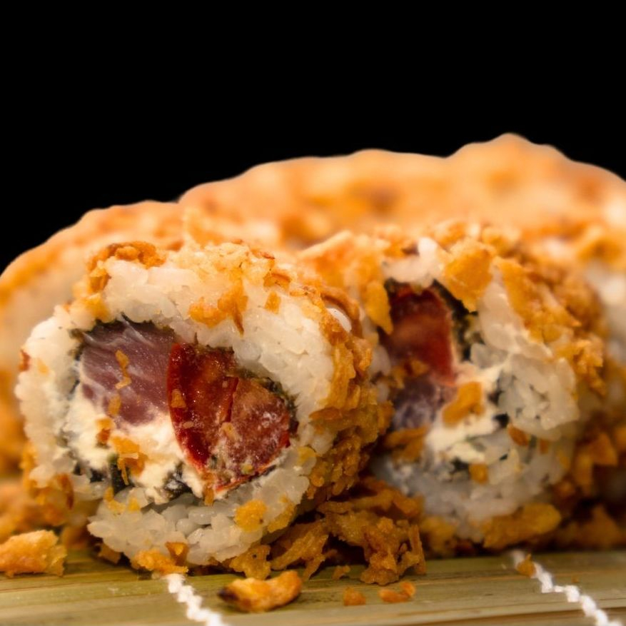 Рис, нори, тунец, томаты, сливочный сыр, криспи лук.