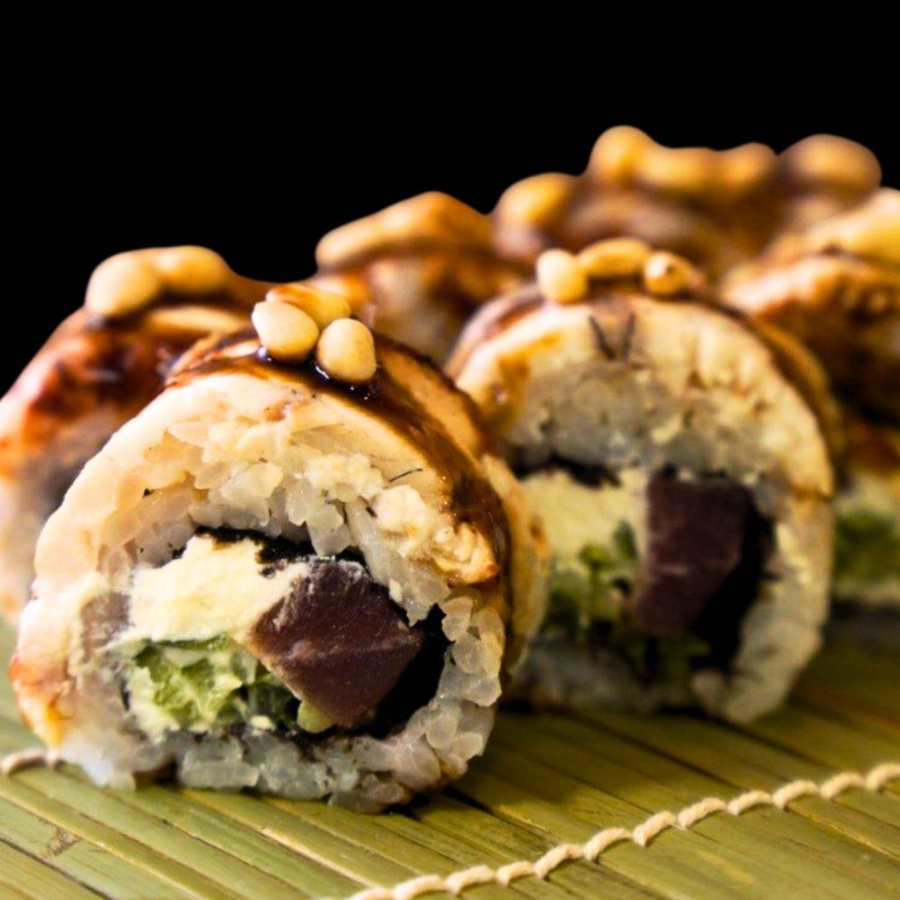 Рис, нори, тунец, сливочный сыр, огурец, угорь копченый, соус унаги, кедровый орех.