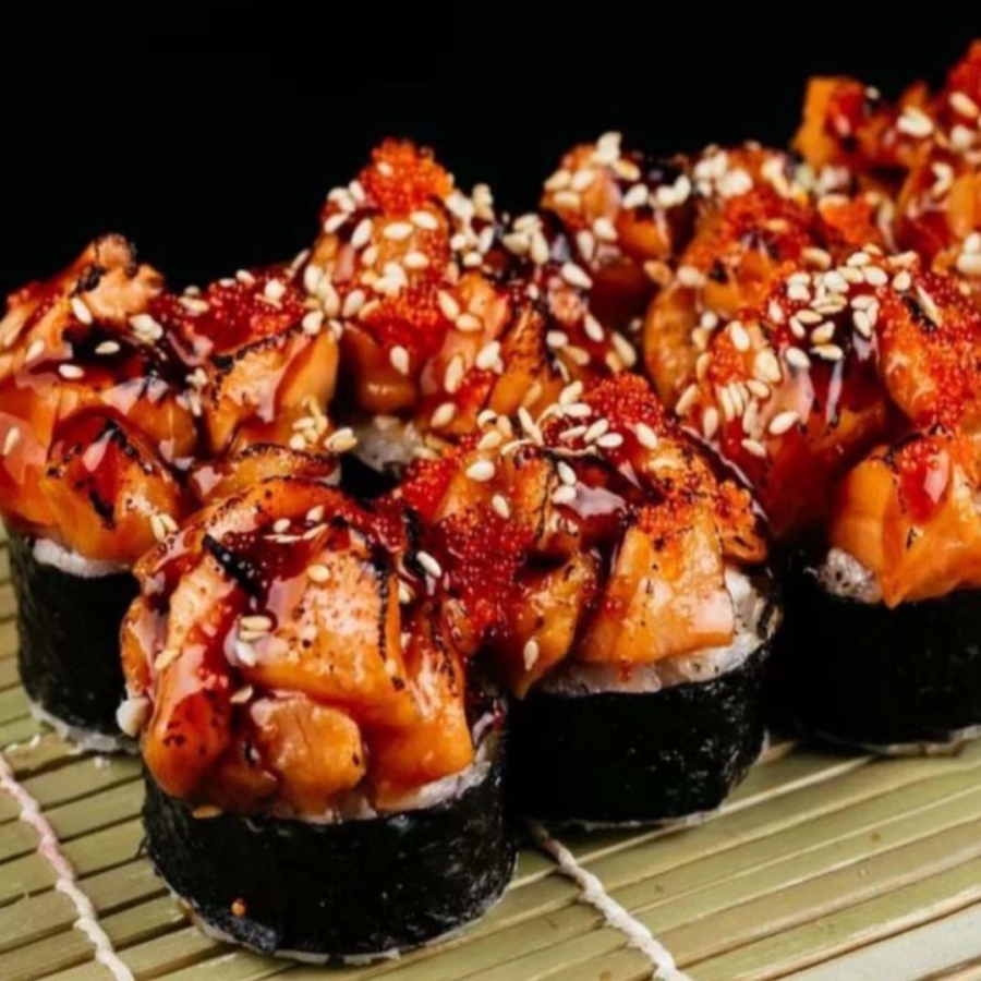 Заказать Рис, нори, лосось, сливочный сыр, огурец, соус терияки, икра тобико, кунжутная смесь.