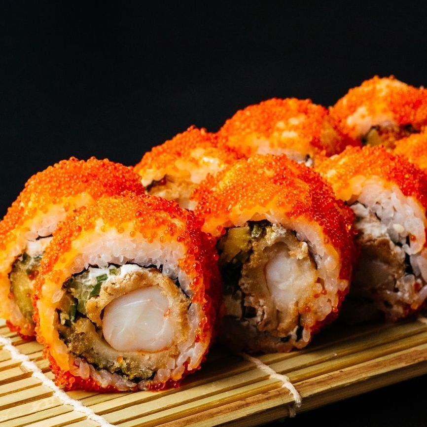Рис, нори, тигровая креветка в темпуре, огурец, сливочный сыр, икра тобико.