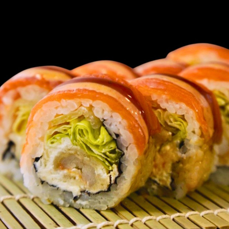Рис, нори, креветка в темпуре, лосось, сливочный сыр, салат айсберг, спайси соус, соус терияки.