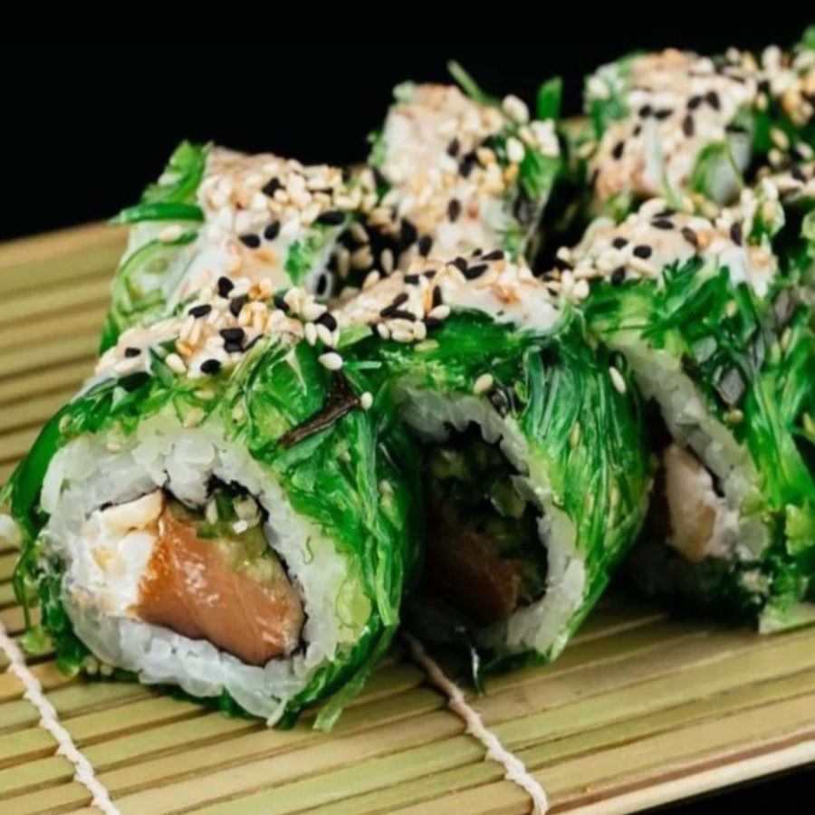 Заказать Рис, нори, копченый лосось, сливочный сыр, огурец, кешью, чука салат, ореховый соус, кунжутная смесь.