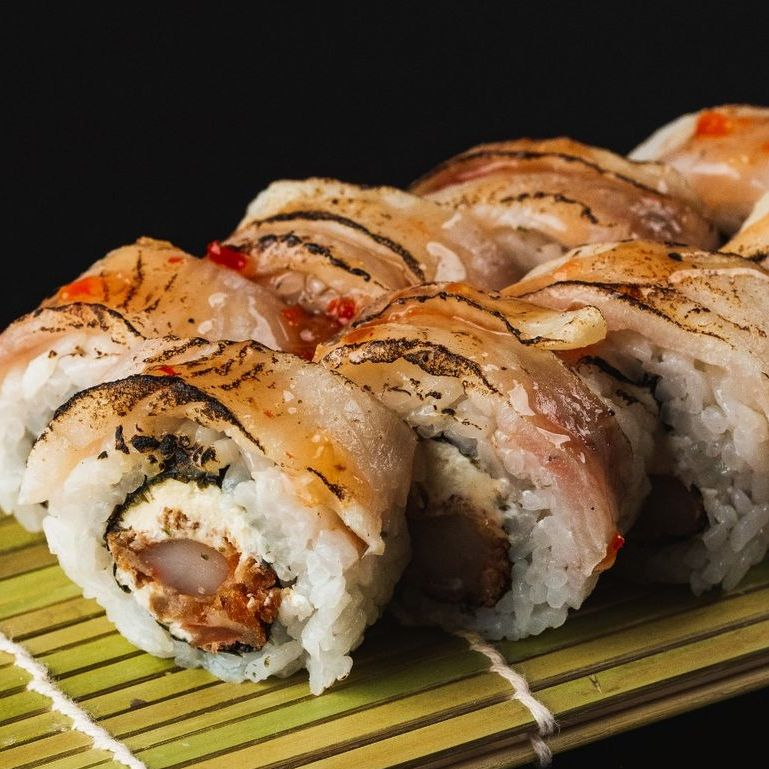 Рис, нори, тигровая креветка в темпуре, сливочный сыр, обожженный окунь, соус кисло-сладкий чили.