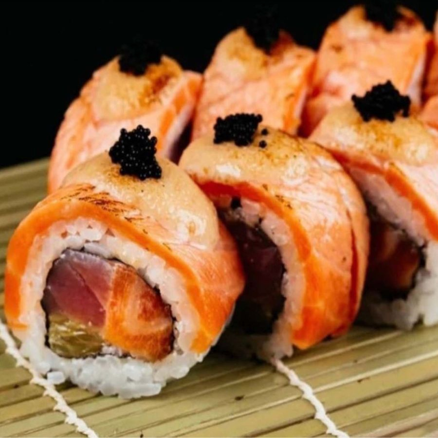 Рис, нори, лосось, тунец, апельсин, соус шрирача, соус с икрой трески, икра тобико.