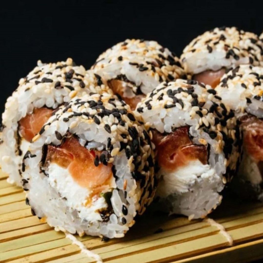 Рис, нори, копченый угорь, сливочный сыр, соус унаги, огурец, кунжутная смесь.