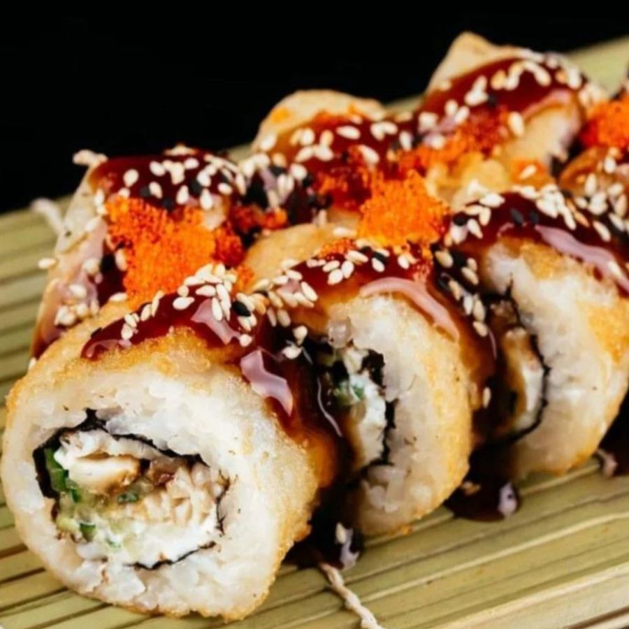 Рис, нори, сливочный сыр, огурец, угорь копченый, кляр, соус унаги, икра тобико, кунжутная смесь.