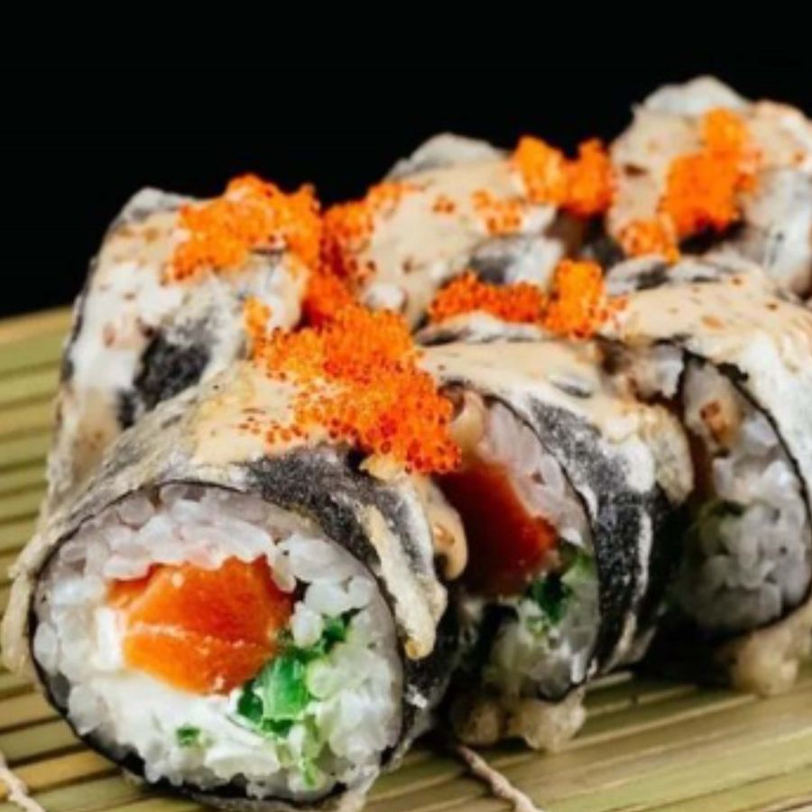Заказать Рис, нори, лосось, сливочный сыр, чука салат, кляр, соус ореховый, икра тобико.