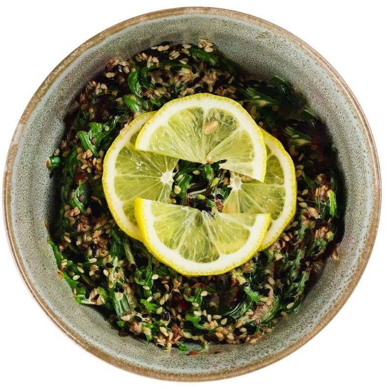 Чука салат, соус ореховый, лайм, кунжутная смесь.
