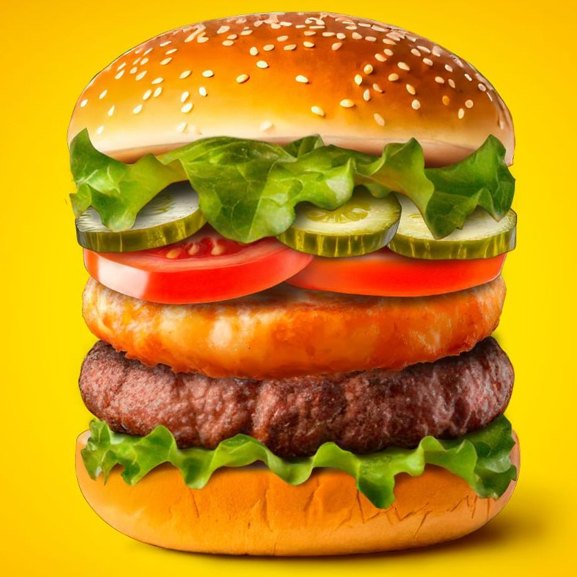 Две котлеты из говядины, 2 ломтика сыра чеддер, бекон, салат айсберг, маринованные огурчики, томат, соус BBQ, соус для бургеров.