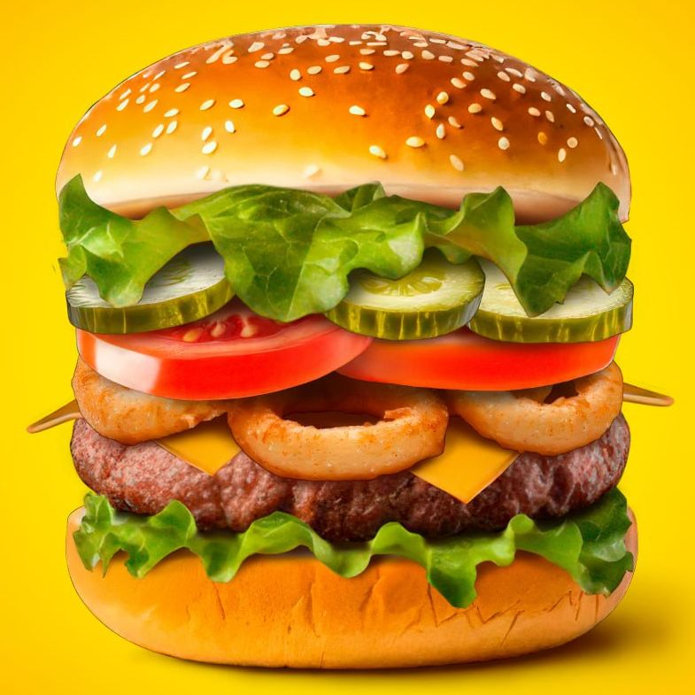 Заказать Две котлеты из говядины, 2 ломтика сыра чеддер, бекон, салат айсберг, маринованные огурчики, томат, соус BBQ, соус для бургеров.