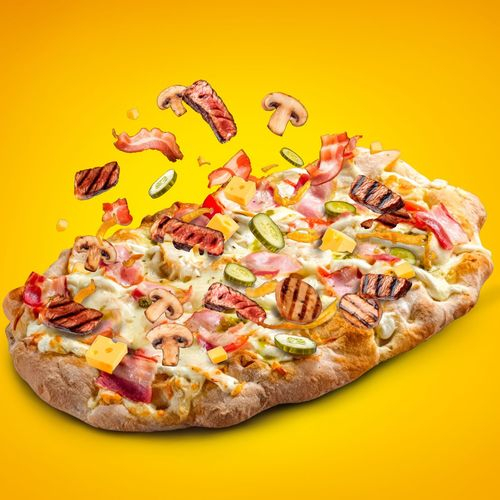 Заказать Говядина гриль, бекон, сыр моцарелла, маринованный огурчик, жареный лук, соус д/пиццы, соус BBQ.