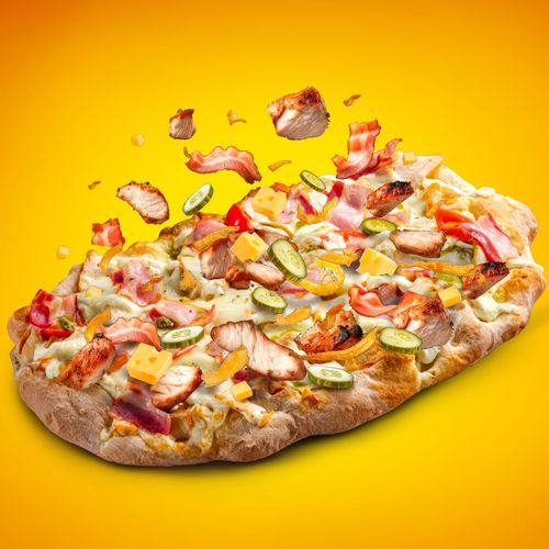 Заказать Курочка гриль, бекон, сыр моцарелла, маринованный огурчик, жареный лук, соус д/пиццы, соус BBQ.