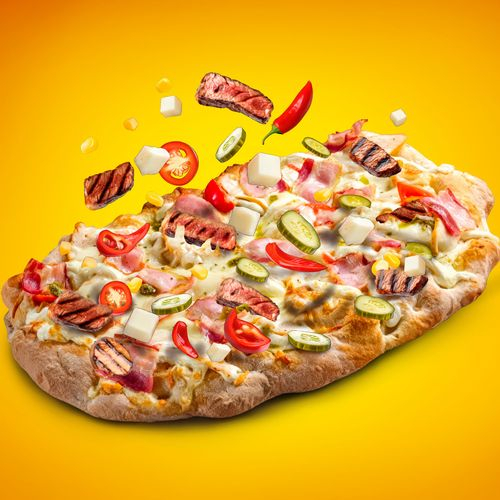 Заказать Говядина гриль, халапеньо, сыр моцарелла, кукуруза маринованный огурчик, жареный лук, соус д/пиццы, соус Сальса.