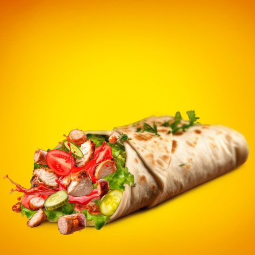 Заказать Курочка гриль, армянский лаваш, сыр моцарелла, чесночный соус, маринованный огурчик, помидорчик, капуста, соус BBQ, сырный соус.