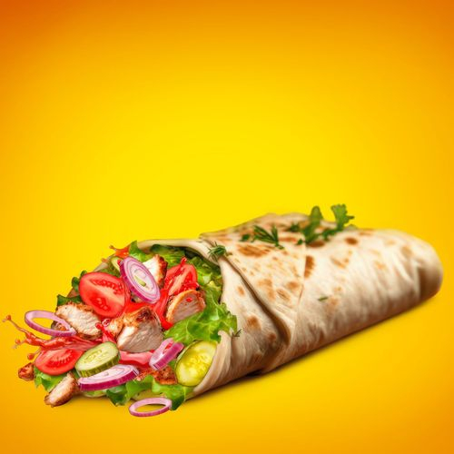 Заказать Курочка гриль, армянский лаваш, чесночный соус, маринованный огурчик, помидор, капуста, кетчуп.